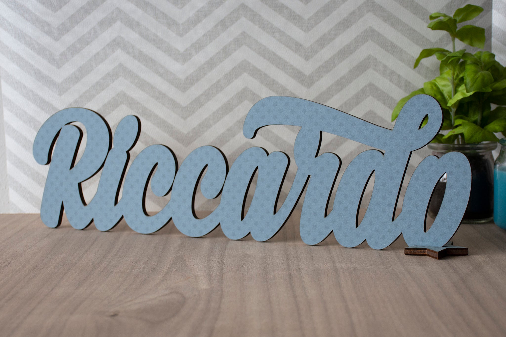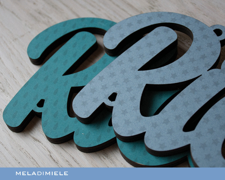 Scritta formata da un nome o parola, realizzata in legno da 6/8mm rivestito nella parte superiore da legno nobile o texture.
