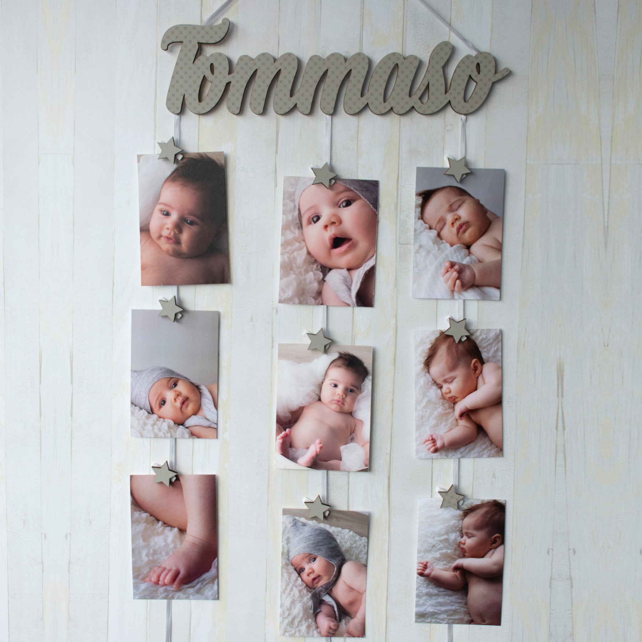 Comprensiva di kit portafoto (9 mollette con cuori o stelle e 3 nastri in raso di lunghezza 2m circa cad) e di basetta per sostegno verticale.