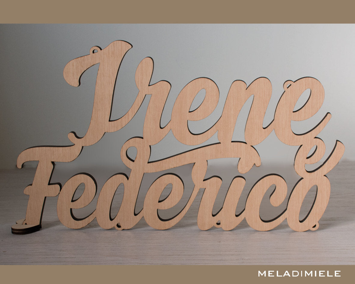 Scritta formata da due nomi o parole, realizzata in legno da 6/8mm rivestito nella parte superiore da legno nobile o texture.