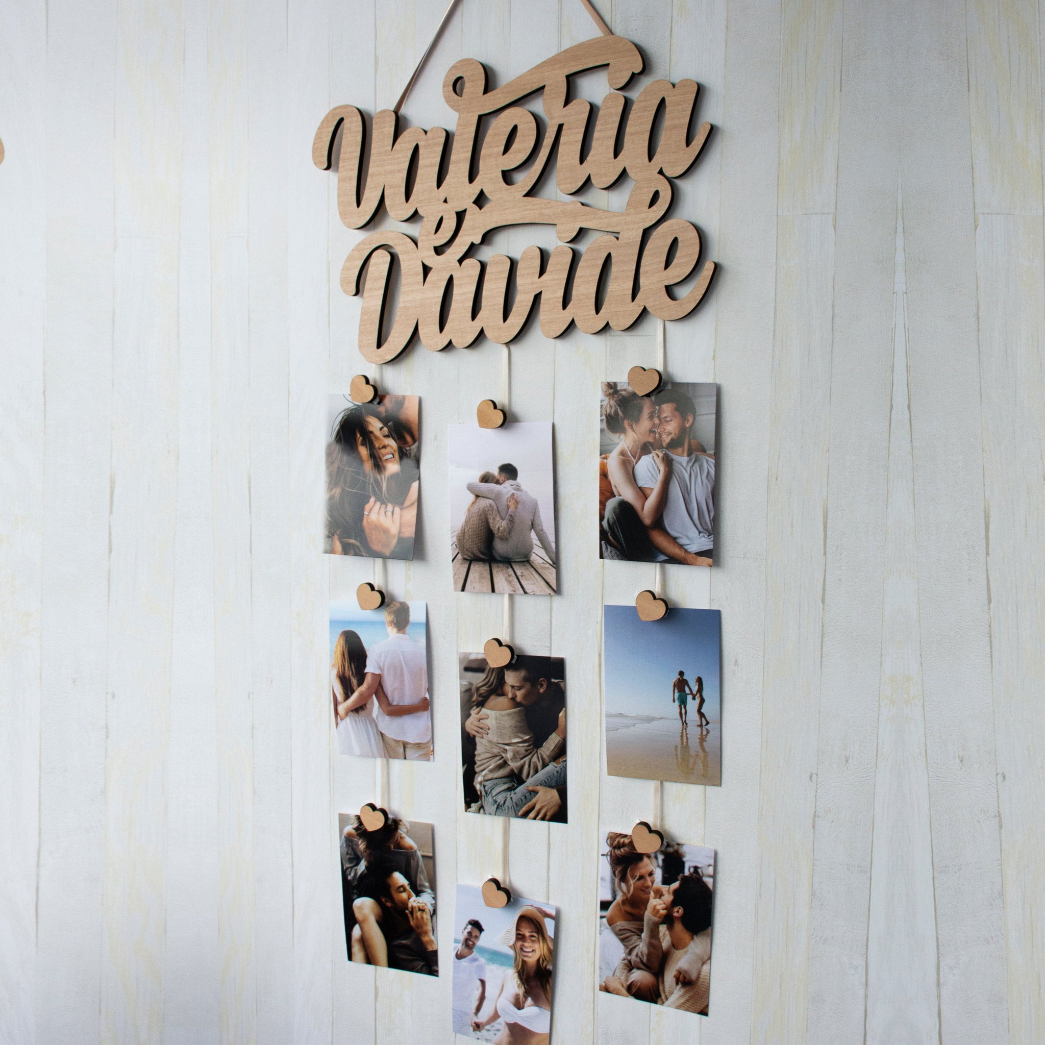 Comprensiva di kit portafoto (9 mollette con cuori o stelle e 3 nastri in raso di lunghezza 2m circa cad) e di basetta per sostegno verticale.