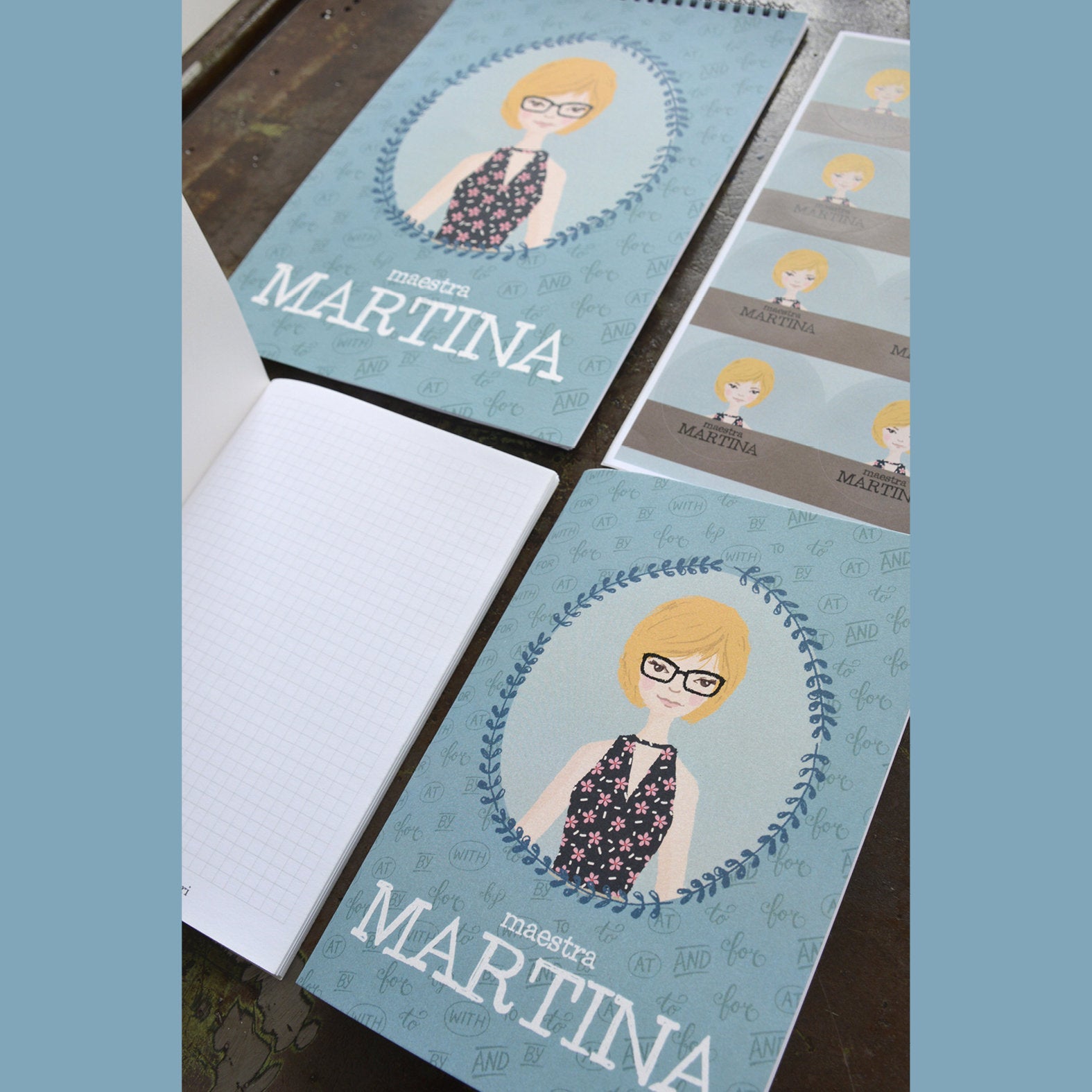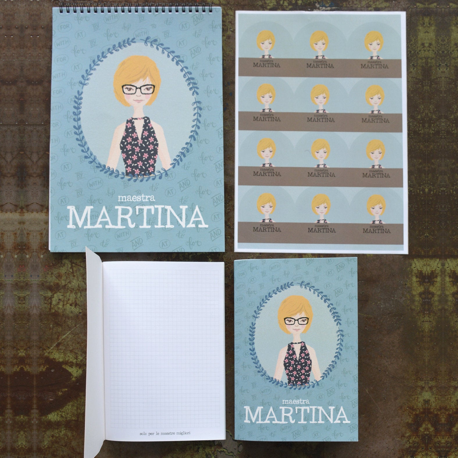 Tutti i prodotti sono personalizzati con il nome della maestra ed un disegno che la ricorda nei tratti