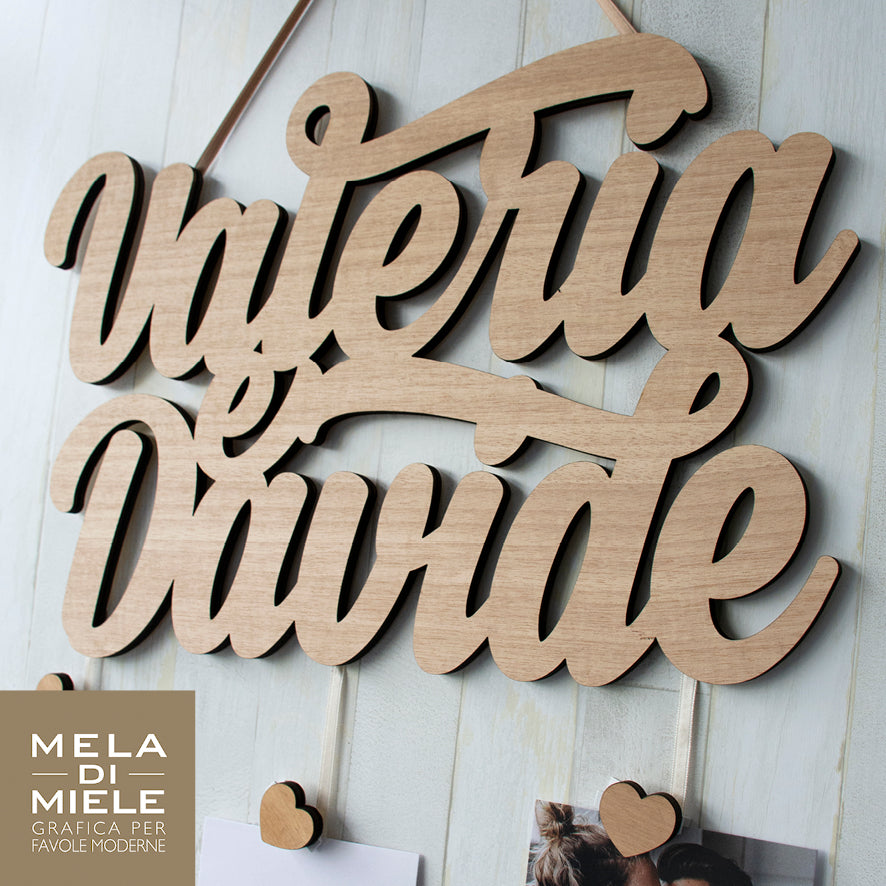 Scritta formata da due nomi o parole, realizzata in legno da 6/8mm rivestito nella parte superiore da legno nobile o texture.
