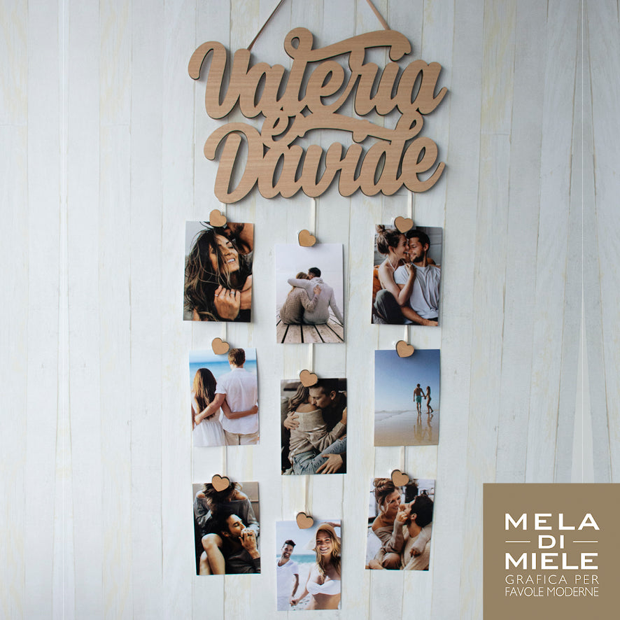 Comprensiva di kit portafoto (9 mollette con cuori o stelle e 3 nastri in raso di lunghezza 2m circa cad)e di basetta per sostegno verticale.