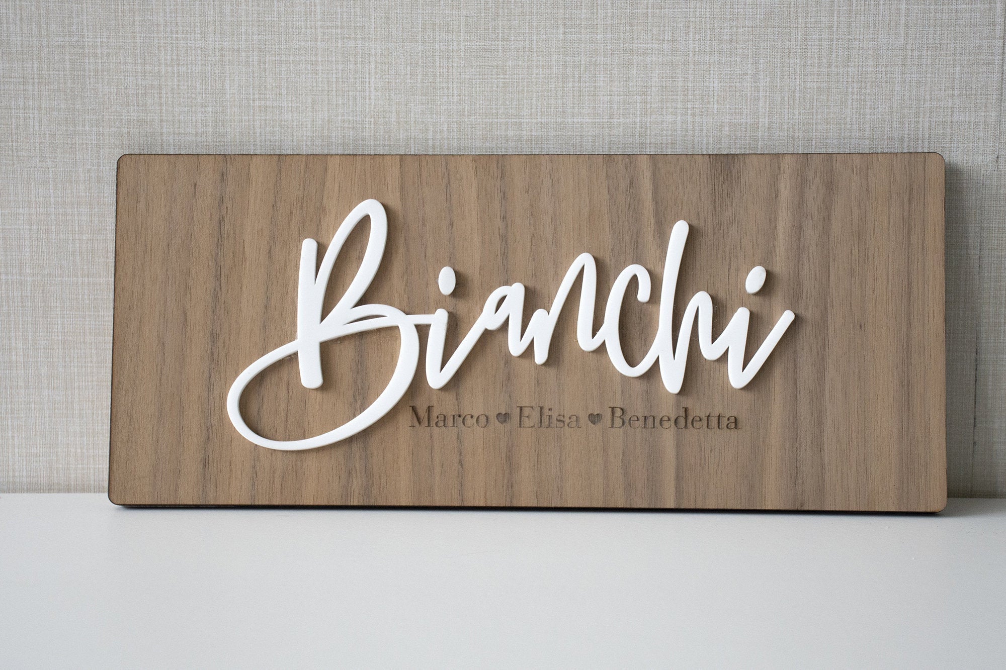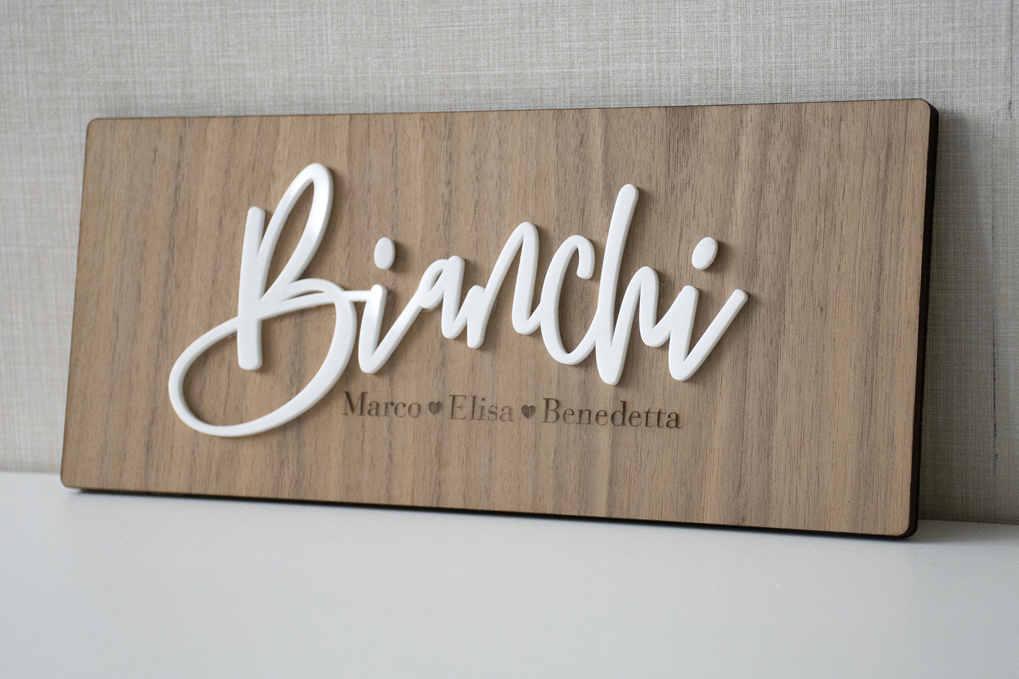 Targa in legno con "Cognome famiglia" in plexiglass biancoe incisione personalizzata Nomi Dimensione 30x13 cm