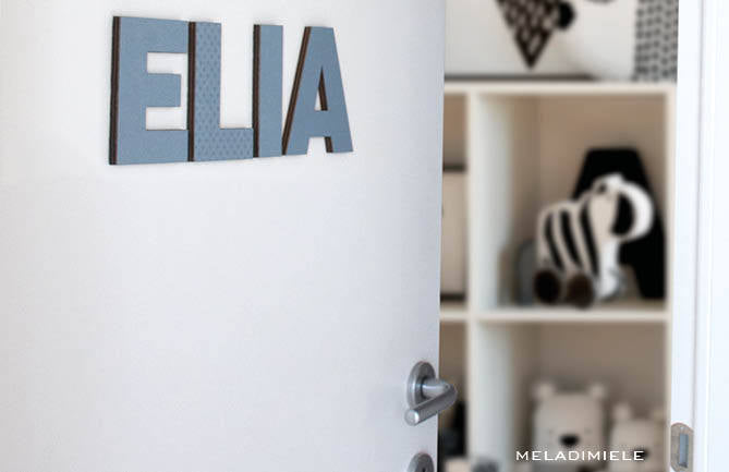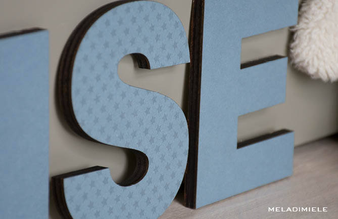Lettera in legno rivestito. Rivestimento di colore Azzurro con texture a stelle. Le vocali non riportano texture.