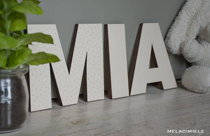 Lettera in legno rivestito. Rivestimento di colore Beige con pois. Le vocali non riportano texture.