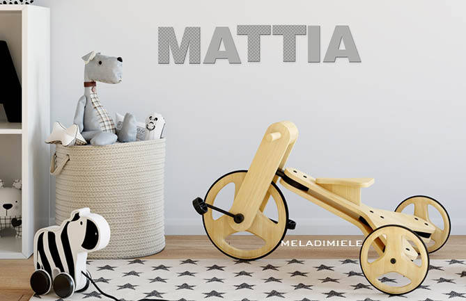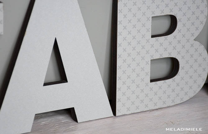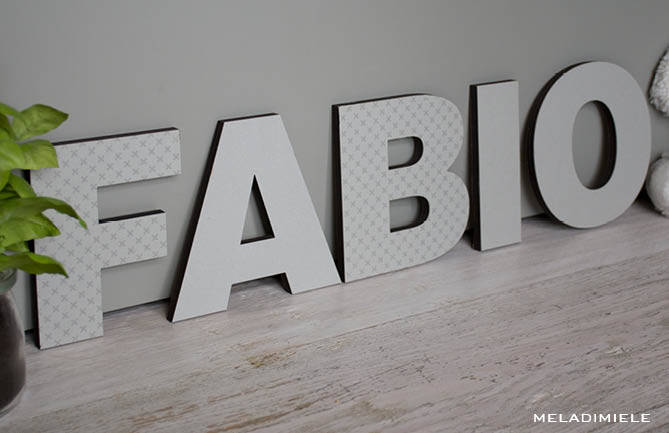 Lettera in legno rivestito. Rivestimento di colore Grigio con texture a croci. Le vocali non riportano texture.