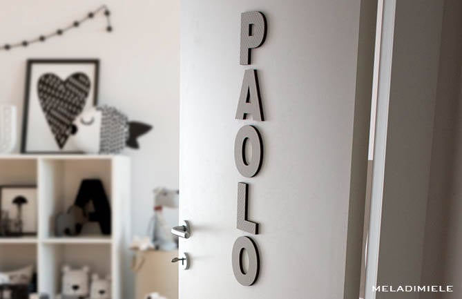 Il retro è in legno grezzo. La lettera viene fornita di biadesivo per poterla fisare su porte o pareti.