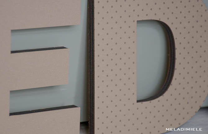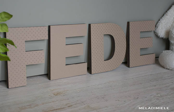 Lettera in legno rivestito. Rivestimento di colore Tortora con pois. Le vocali non riportano texture. Il retro è in legno grezzo. La lettera viene fornita di biadesivo per poterla fisare su porte o pareti. Altezza 12 cm - Spessore. 8mm Nelle note per il venditore che si trovano dopo aver effettuato l'ordine indicare le lettere che si desiderano ricevere.