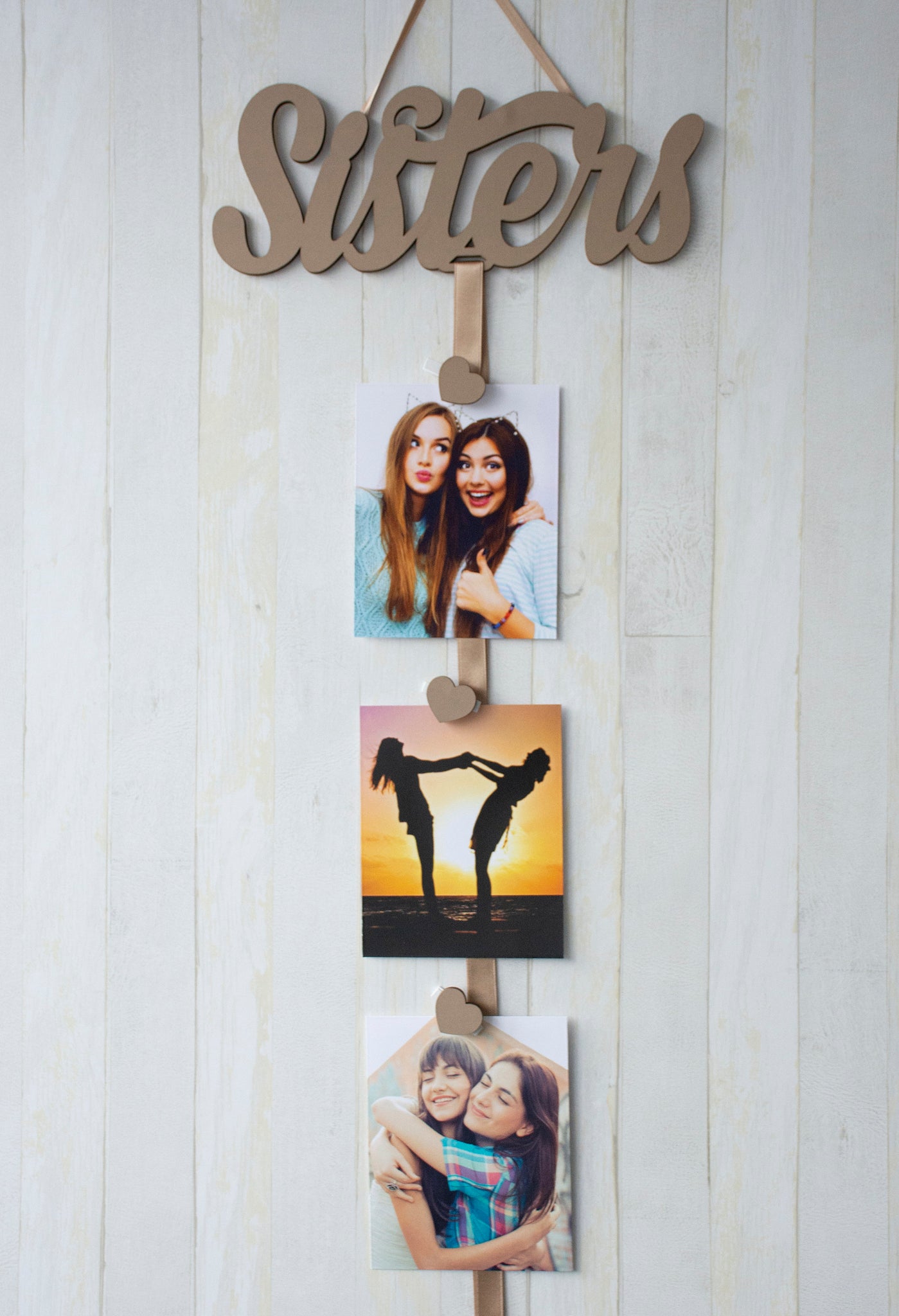 Scritta portafoto "Sisters", realizzata in legno da 6mm rivestito in carta color tortora Comprensiva di kit portafoto(6 mollette con cuori o stelle e 1 nastro in raso di lunghezza 1 m circa cad)